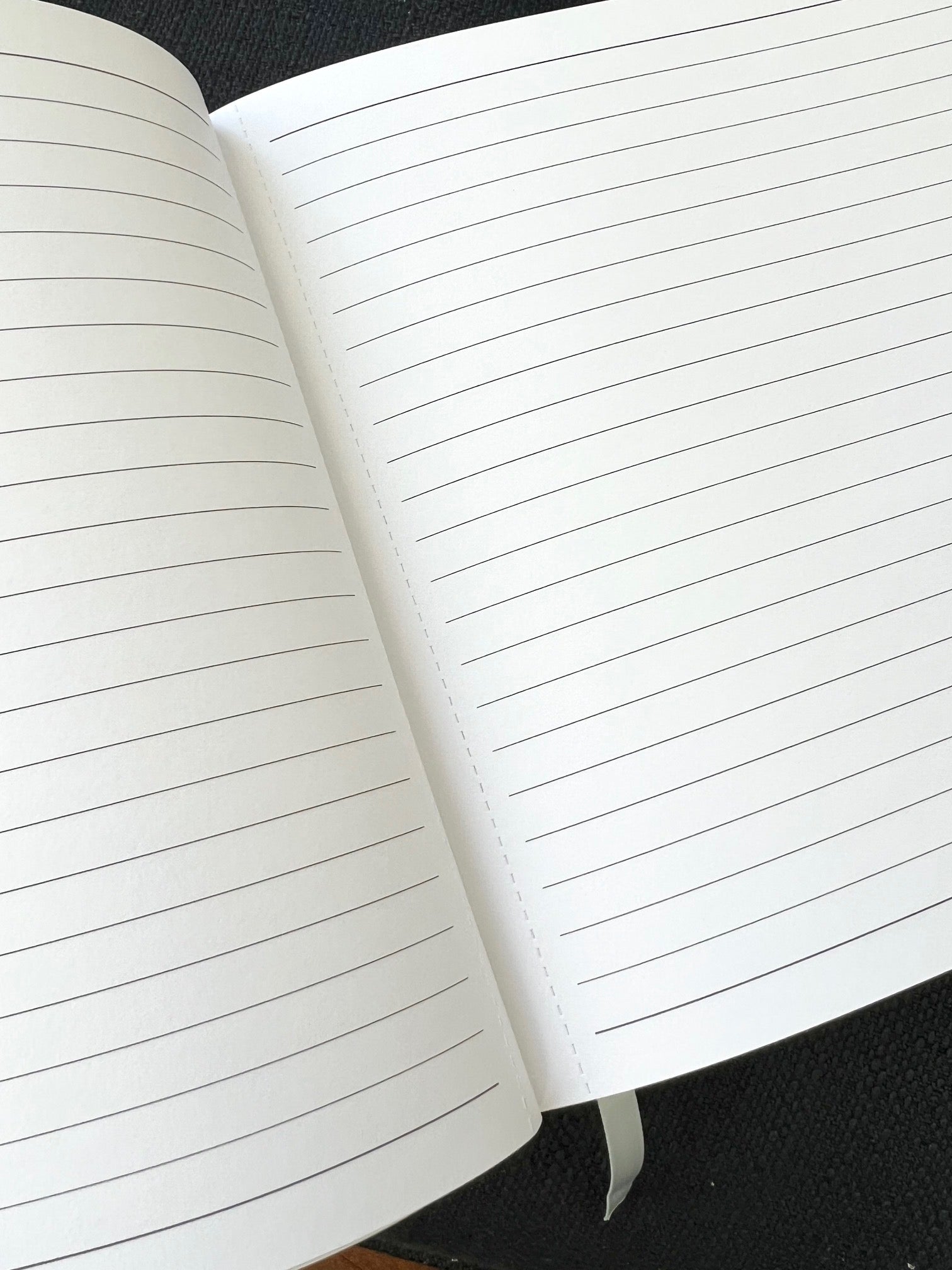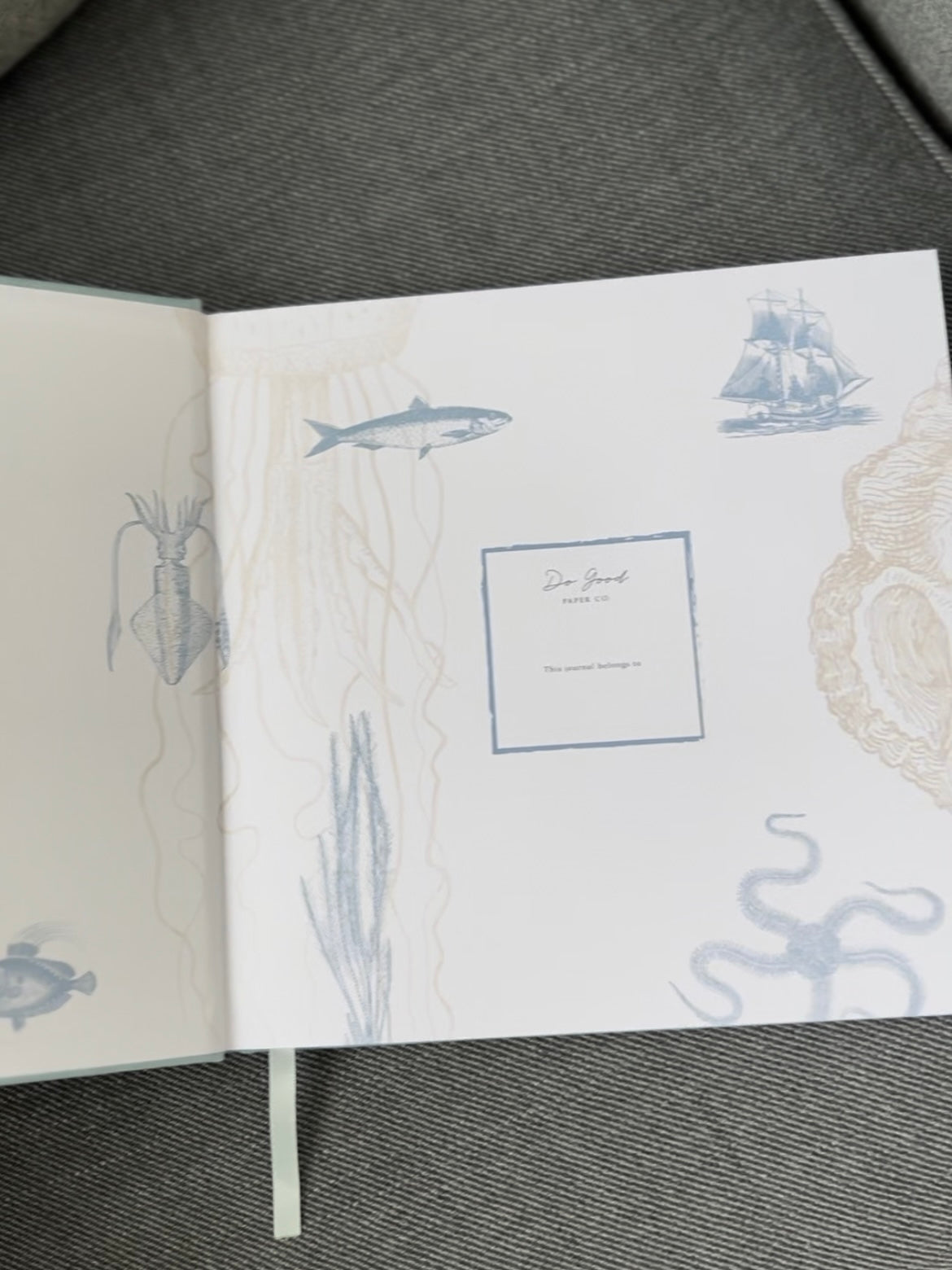 This is a square-shaped journal that can double as a guest book. The light blue vegan leather covers are smooth but look textured. The front cover features the words "The Sea is Calling". Flip open the cover to find a gorgeous end-sheet spread with vintage sea creature illustrations. There are 240 lined inner pages, made of 100-gsm, white, recycled paper, that are also perforated! Size: 8x8 in.