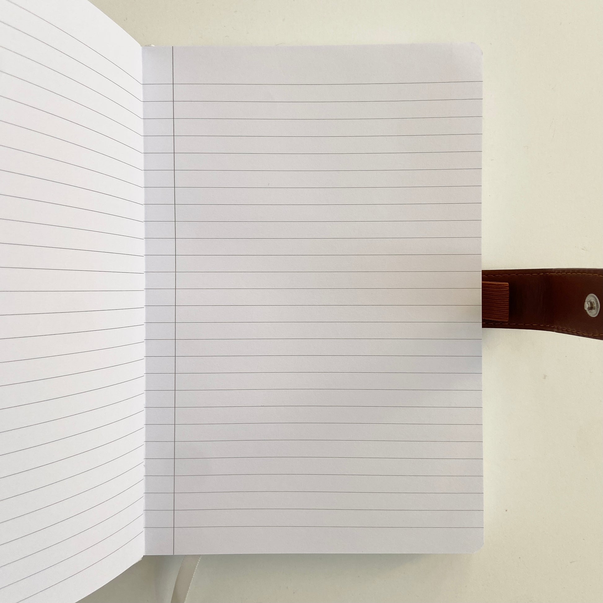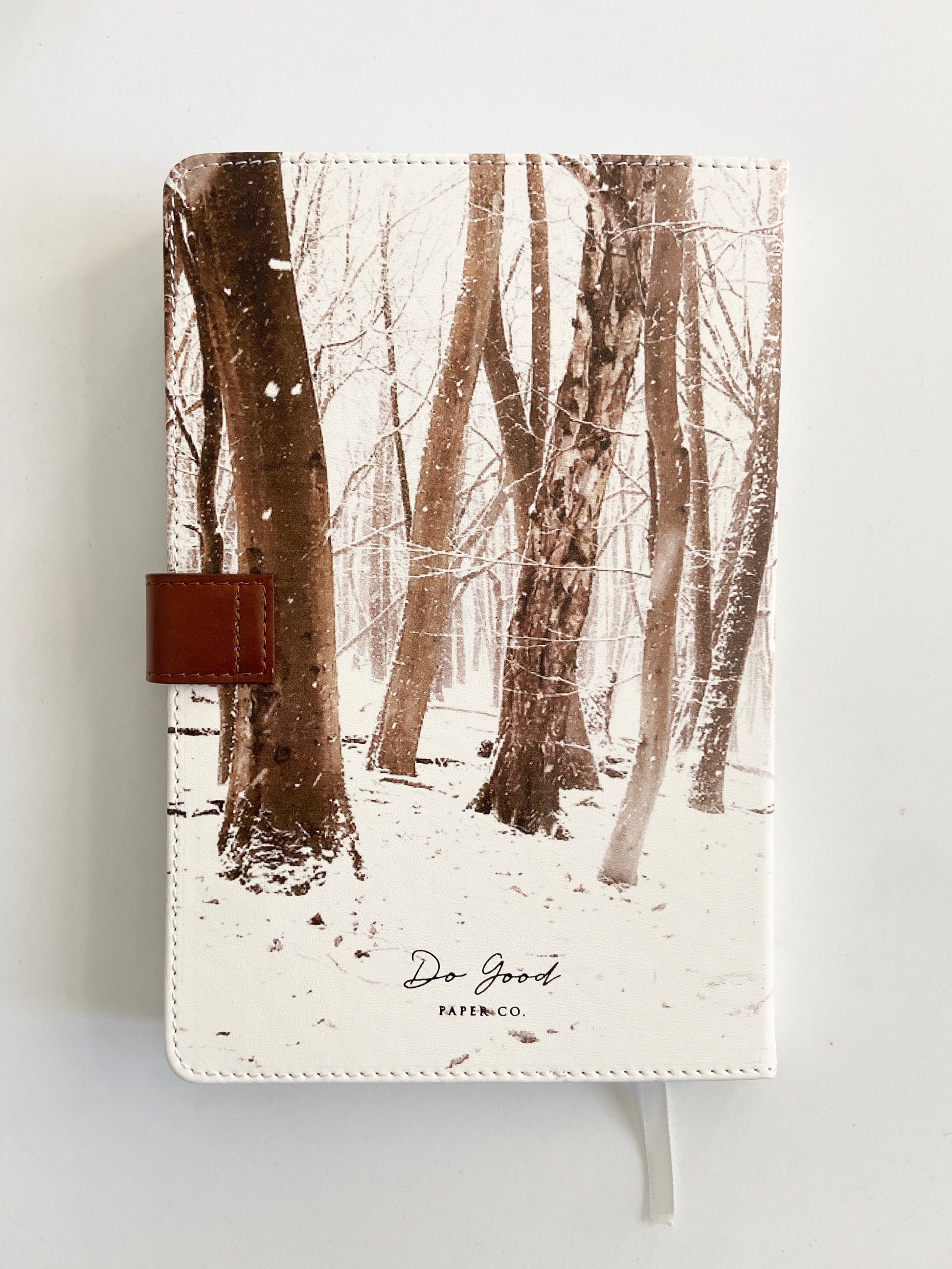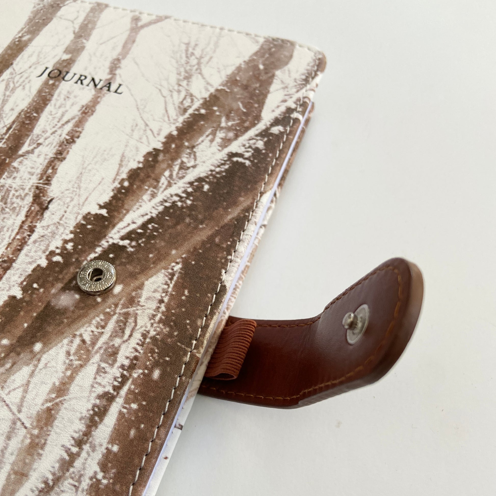 Connect with nature through the wintery forest scene featured on the covers of this journal, and photographed by Jenny Frear. A brown faux leather strap hides a buckle and an elastic pen loop, and gives this journal a premium look. Includes a white ribbon bookmark and 200 pages of white, lined, thick (120 g) paper; 5.8 x 8.4 in. (A5)
