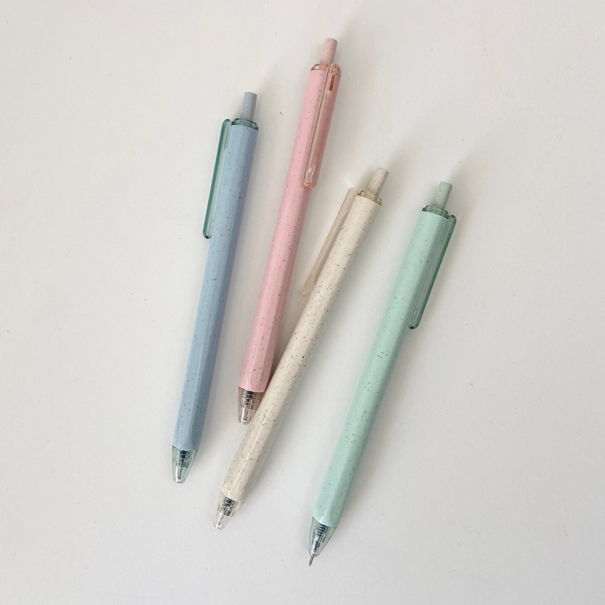 Do Good Paper Co.'s eco pens are made of wheat straw, a bio-plastic that makes use of what would have become waste once the wheat is harvested. These needle-tip rollerball pens write very smoothly. Black ink; set of 4; available in 2 colour choices: all off-white or multi-colour (pink, green, blue and off-white).