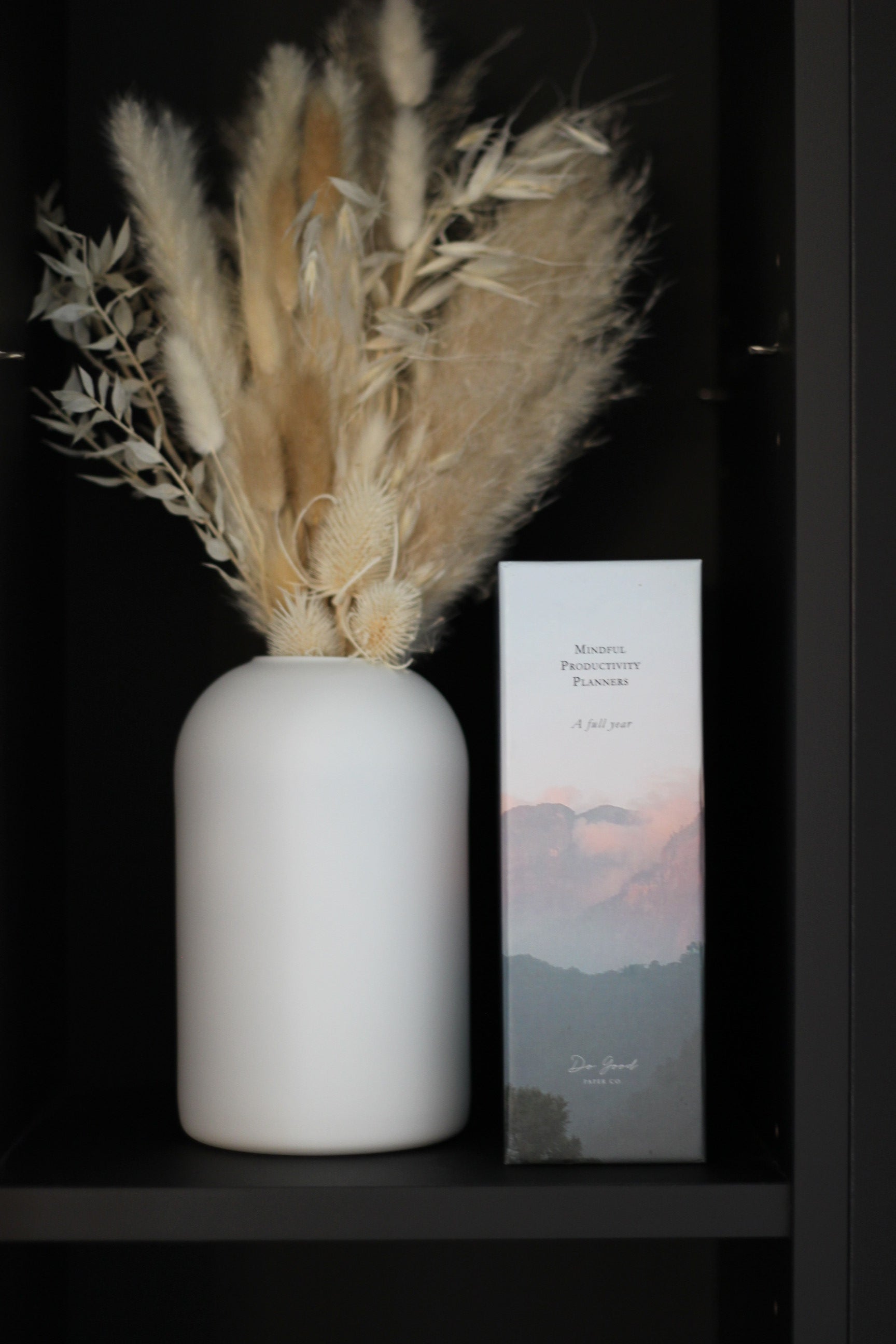 The box is designed with a calming mountain landscape, making it a gorgeous addition to your desk or bookshelf. Included are 4 planners, one for each quarter, and each in a different colour (sage, grey, mauve and stone).