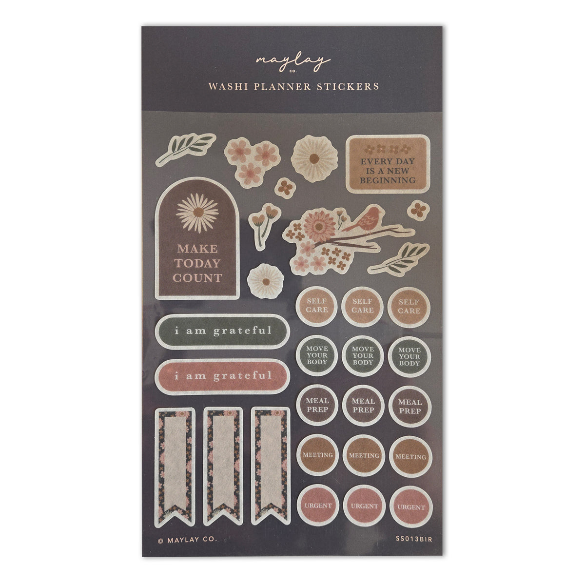 Add a touch of calm, intention, and gentle reminders to your day with Maylay Co's Washi Planner Stickers. This sticker sheet features soft, earthy tones and delicate illustrations of florals and a birdy on a branch, as well as reminders that each day counts.
